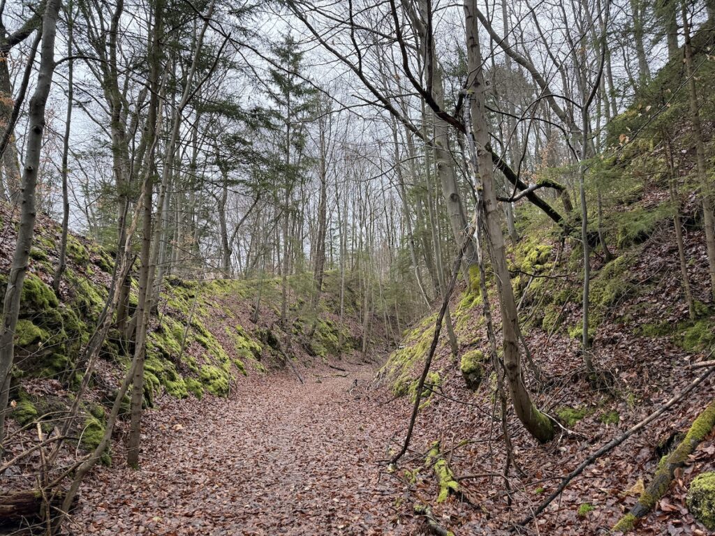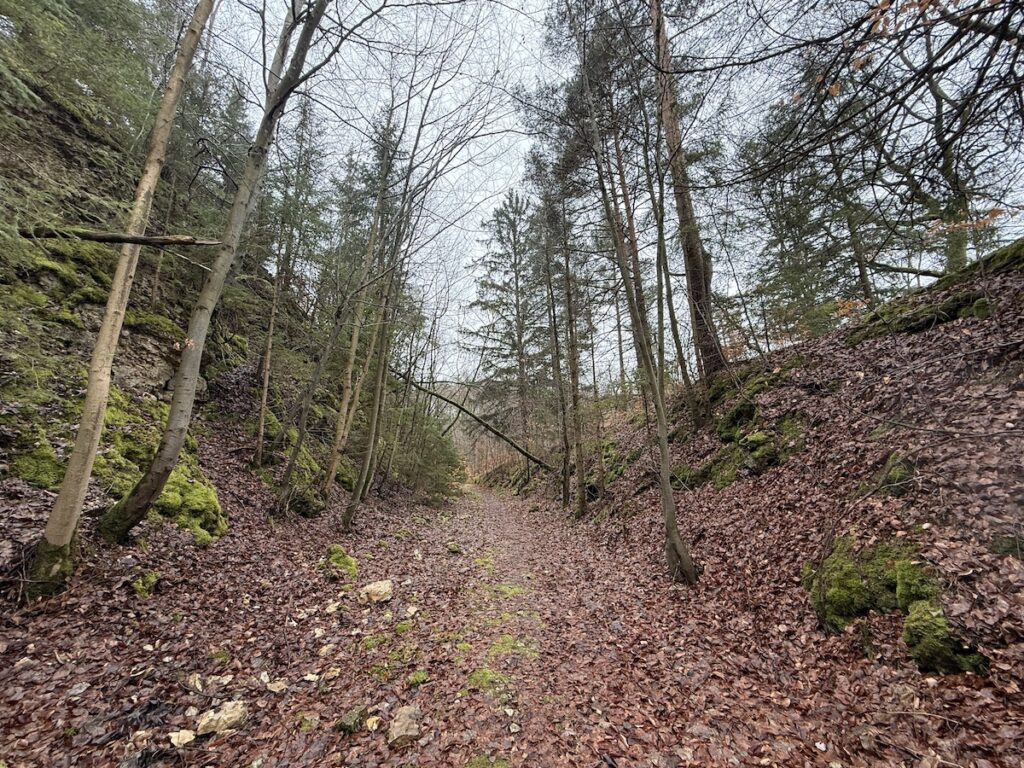 - Links neben der eigentlichen Schättere-Trasse verläuft ein regulärer Schotterweg, der für die regelmäßig stattfindenden Waldarbeiten benötigt wird. Diesen Weg bin ich in den letzten Jahren häufig entlang gelaufen, er bringt viele zusätzliche Steigungen mit sich, da man hierfür nicht den Fels durchschnitten hat. Auf dem Weg hinauf (in Richtung Ebnat) wählte ich auch gestern diesen Weg. Dabei blickte ich immer wieder nach rechts auf die alte Trasse. Und ich sah, dass – vermutlich durch Mountainbiker, Wanderer und andere Trailrunner – ein passabler Pfad erkennbar war, der durchweg zu sehen blieb und auch noch komplett freigeräumt zu sein schien. Das wollte ich dann unbedingt testen.