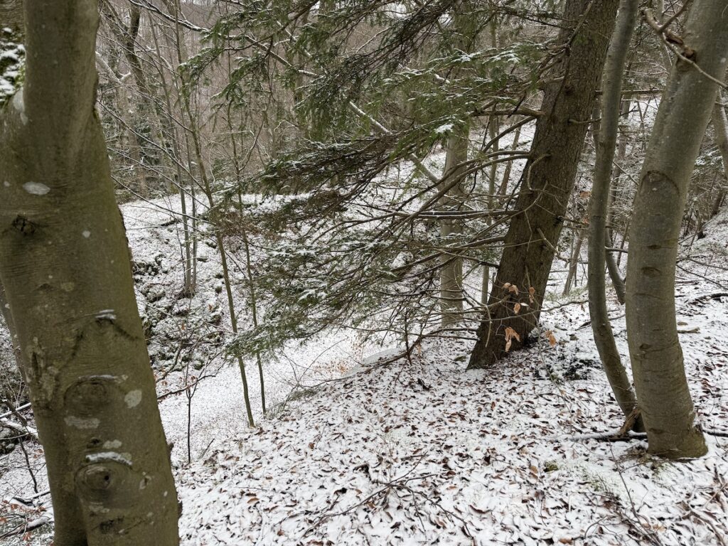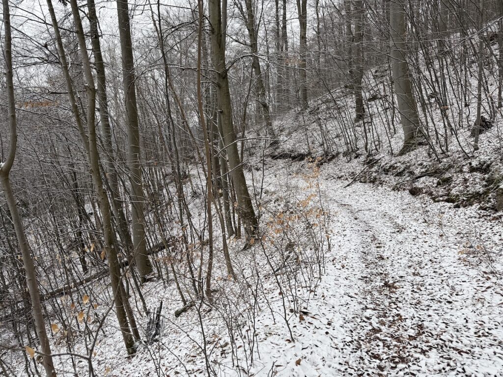 Auf dem Rückweg habe ich eine Alternativroute gewählt, einerseits zur Abwechslung, andererseits erspare ich mir den bei Schnee doch etwas unangenehmen Abstieg neben dem Fledermaustunnel. Hinauf ist das kein Problem, hinab vermeide ich die Strecke lieber – dafür gibt’s nur 200-300 Meter den Hang hinauf versetzt diese schöne Alternative.