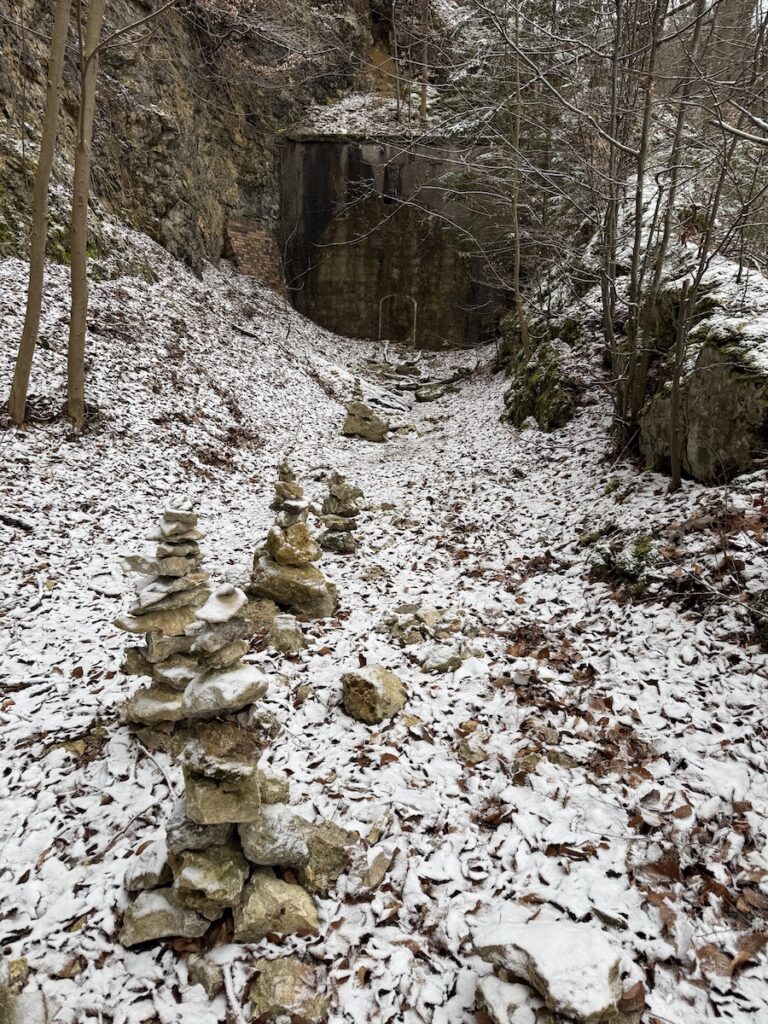 Die schlimmste Steigung auf dieser ganzen Strecke ist der Übergang über diesen Buckel, denn die Eisenbahn durfte früher durch diesen Tunnel fahren. Doch der ist seit Jahrzehnten für die Fledermäuse reserviert (und ich gönne es ihnen), also müssen Mountainbiker, Wanderer und Läufer ein paar Meter versetzt recht steil hinauf kraxeln…