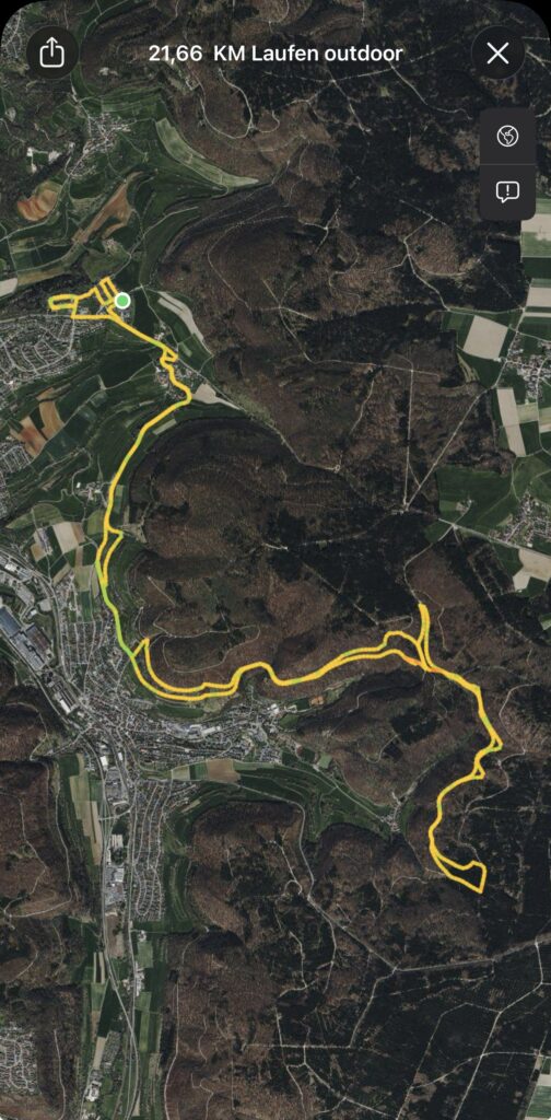 Haha! Gestern lag am Morgen eine kleine, aber feine Puderschicht aus frischem Schnee auf der Ostalb. Das konnte mich nicht abhalten, die gerade einmal einen Tag zuvor wiederentdeckte Strecke – dieses Mal anders herum – gleich wieder zu laufen.