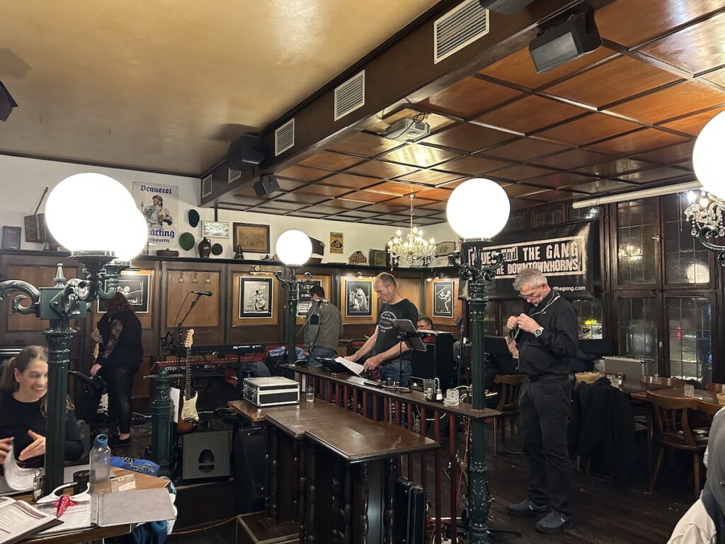 Hier sieht man uns beim Aufbauen im letzten Jahr – und, ja, das Foto täuscht: Da ist gefühlt deutlich mehr Platz als das Bild suggerieren mag. Auf den ersten Blick eine ganz normale Bahnhofskneipe, doch die Akustik war gut – und im Verlauf des Abends fand sich eine erstaunliche Schar von Blues-Fans ein, die mit uns groovte und sich dabei Getränke und diverse Gerichte schmecken ließ. Sehr schön!