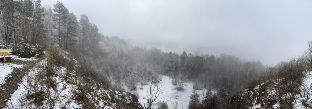 Und tatsächlich, auf dem Braunenberg lagen gut 2-3 Zentimeter Schnee, auch wenn die Waldwirtschaftswege weitgehend frei waren. Laufen war kein Problem, es war nirgends rutschig, aber der Nebel war ganz schön dicht.
