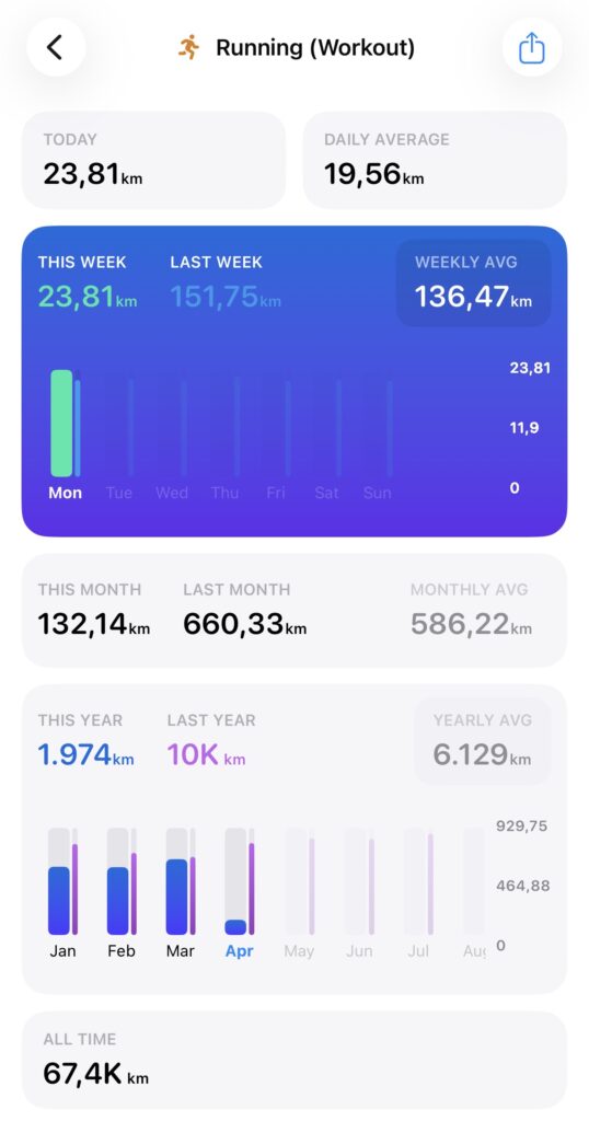 Dennoch bleibe ich meinem selbst auferlegten Ziel treu: In der Regel gibt es höchstens einen Halbmarathon am Tag, die Ausnahme müssen in Zukunft die vom Marathon-Coach verordneten längeren Läufe (30K oder 30+K) sein. Da diese nur einmal alle zwei Wochen, später einmal pro Woche stattfinden, werden sie kaum ins Gewicht fallen.