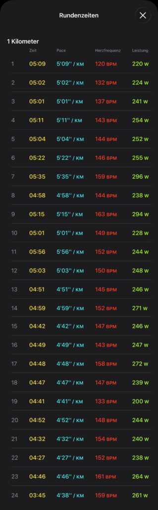 Und dann wurde es richtig flink, denn ganz entgegen aller Erwartungen lief schon der erste Kilometer sehr gut. Üblicherweise liege ich hier zwischen 5:15/km (das wäre schon außergewöhnlich für den ersten Kilometer) und 5:40/km (gelegentlich geht es sogar noch langsamer), heute jedoch bei 5:09/km – das war mir ein Zeichen…