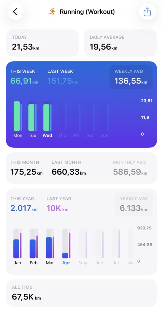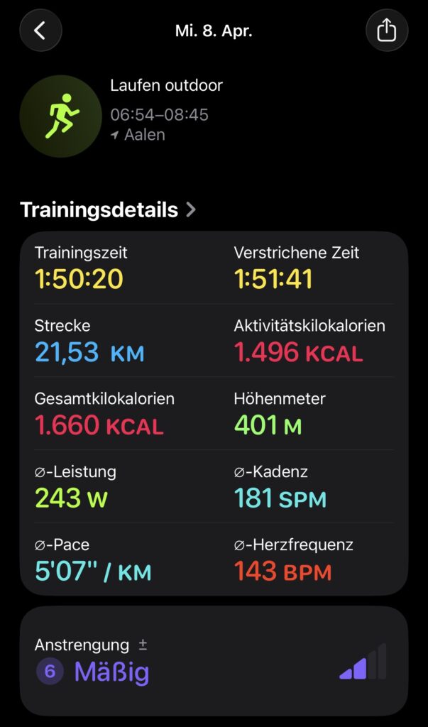 Getragen wurde ich – wie immer – von meinem aktuellen Hörbuch. Die Strecke entsprach weitestgehend meiner üblichen Route, ich übe mich weiterhin (meist) in Zurückhaltung. Allerdings sehe ich schon jetzt, dass mein Ziel (50% von 2025) wohl verfehlt wird. Dafür dürfte ich nur noch 3.000 km laufen, kann sein, dass ich mich nicht ganz daran halte….