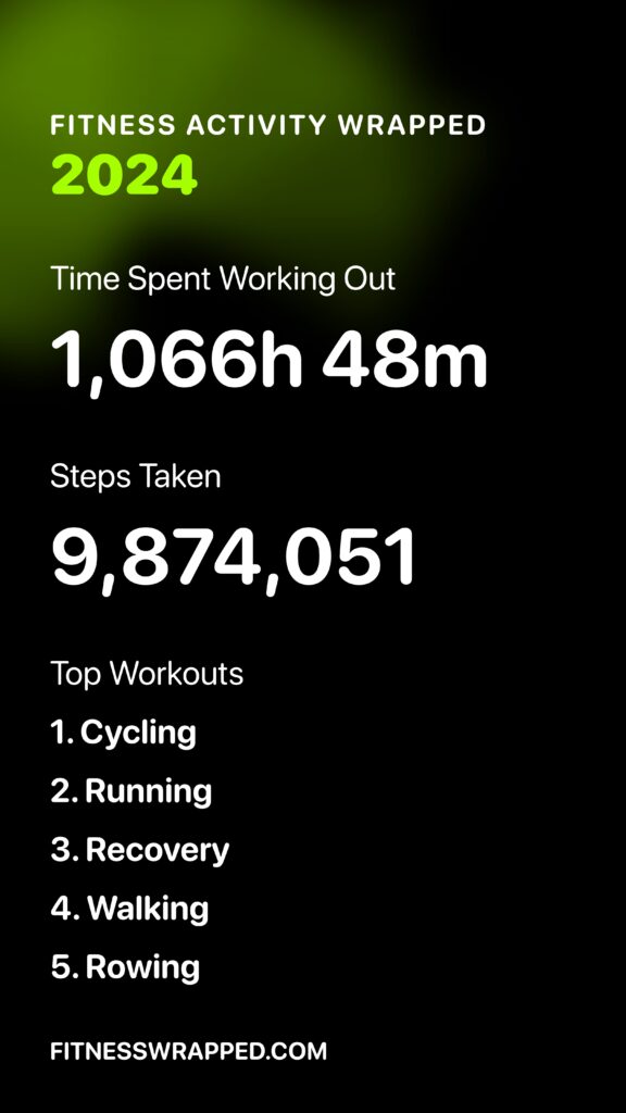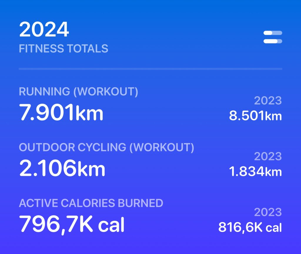 Ein weiteres Jahr geht heute zu Ende, Zeit für einen kleinen Rückblick – in Ermangelung großer Zielsetzungen fasse ich mich kurz. Nach wie vor war das Laufen meine dominante Sportart – auch wenn die App Fitness Wrapped das Radfahren an die erste Stelle setzt, was aber kein Wunder ist, denn wenn ich radle, dann in der Regel mindestens zweimal am Tag, also sammeln sich hier fast doppelt so viele Trainings an.