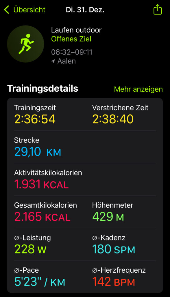 Mit dem heutigen Lauf habe ich mein erst kurz vor knapp gesetztes Jahresziel von 7.900 Kilometern erreicht – wie fast zu erwarten war es keine Punktlandung. Aber das ist mir egal. Im letzten Jahr bin ich 600 Kilometer mehr gelaufen, insofern konnte ich meinen einzigen Vorsatz (etwas weniger zu machen) tatsächlich erfolgreich umsetzen.